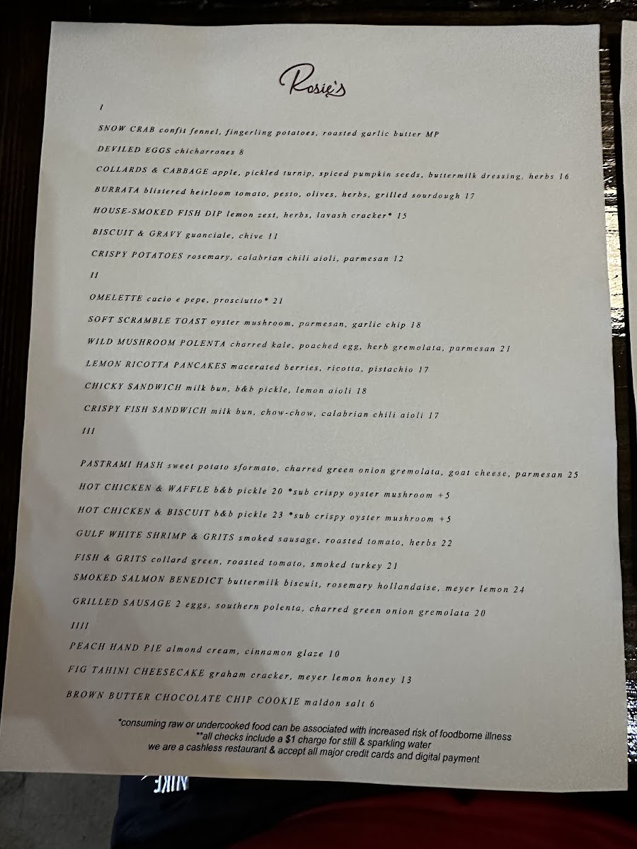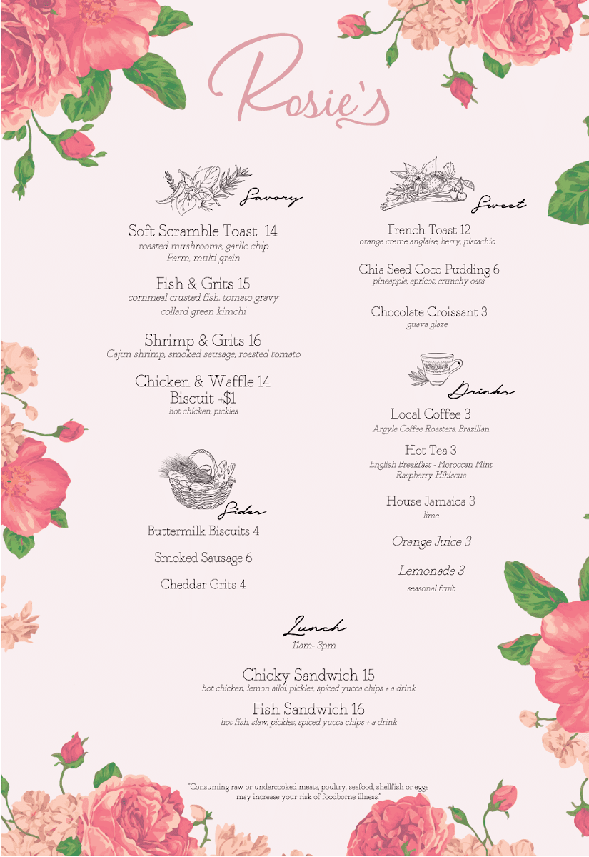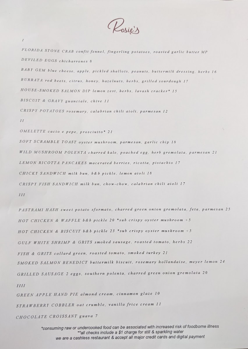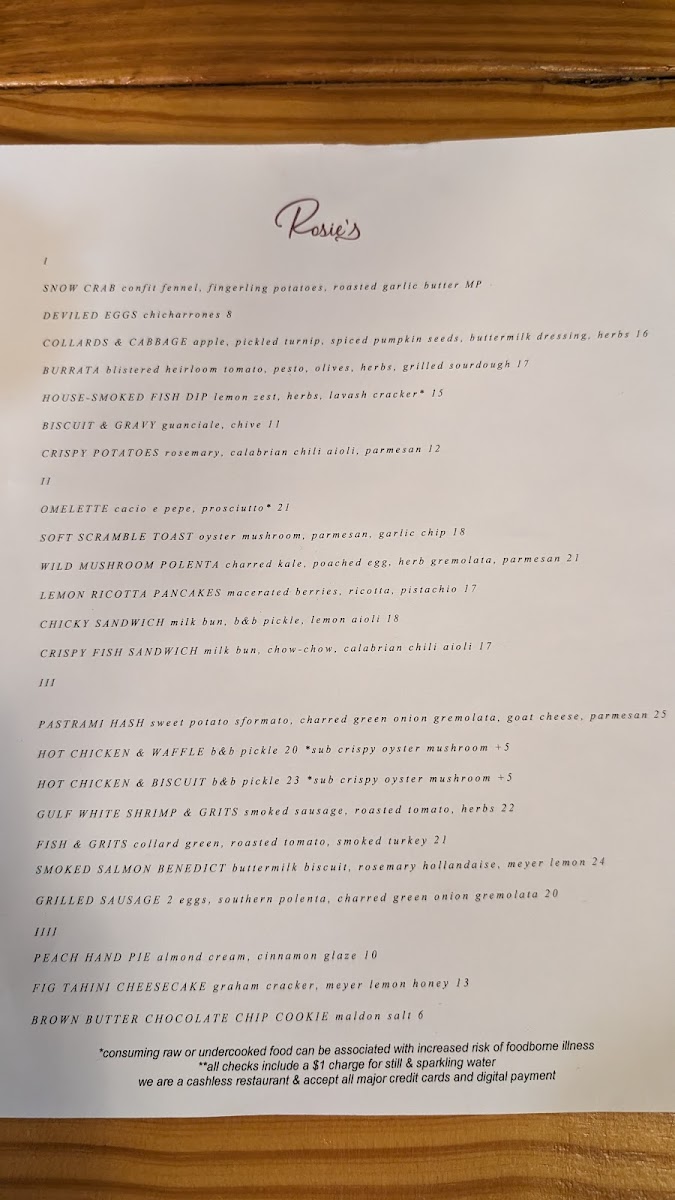 From a reviewer’s perspective, the menu at Rosie's Miami feels like a thoughtful snapshot of the restaurant’s identity-comforting, creative, and confidently curated. The pastry selection sets a warm, inviting tone with Strawberry Rhubarb Hand Pie, Lemon Pound Cake, Pumpkin Bread, Rhubarb Olive Oil Cake, and the classic SD Buttermilk Biscuit, all perfect for easing into the meal. Hot beverages such as Sticky Rice Pu’er, Berry Delicious, Flower Power, and Clouds & Mist add an artisanal, almost meditative touch, while the coffee lineup-from Cortado and Americano to Golden Latte, Argyle Cold Brew Can, and Double Espresso-rounds out the experience with dependable quality. Vegan diners are clearly considered, with satisfying options like V- Stewed Okra And Grits, V- Wild Mushroom Toast, V- Wild Mushroom Polenta, V- Crispy Potatoes, and V- Collard And Cabbage Salad standing confidently alongside the rest of the menu rather than feeling like afterthoughts. The heartier sections shine with Southern-inspired comfort dishes such as Gulf White Shrimp & Grits, Chicken & Biscuits, Smothered Chicken & Grits, Oxtail Benedict, and Grilled Sausage, while earlier sections highlight crowd-pleasers like Burrata, Whipped Ricotta Toast, Mushroom Hand Pie, Deviled Eggs, Cacio E Pepe Omelette, Avocado Toast, Lemon Ricotta Pancakes, and Crispy Mushroom Sandwich. Thoughtful sides-SD Honey, Roasted Baby Carrots, SD Crispy Fish Side Gravy, and 2 Eggs-allow for easy customization. Drinks are equally well-curated, with iced options like GOLDEN ROSE and KICKASSAM, plus an appealing mix of bubbles and rosé/orange wines by the glass and bottle, including GL Bodegas Breca, Rosé, Ca’Furian Prosecco Rosé, Antoine Muller Champagne, Flora Prosecco, and Ca’ Furian Moscato. Even the Byob Corkage Fee is clearly noted, reinforcing a sense of transparency. Altogether, the menu reads as cohesive and welcoming, blending indulgence and balance in a way that leaves a strong final impression of Rosie's Miami as a place that truly understands its guests and its culinary voice.