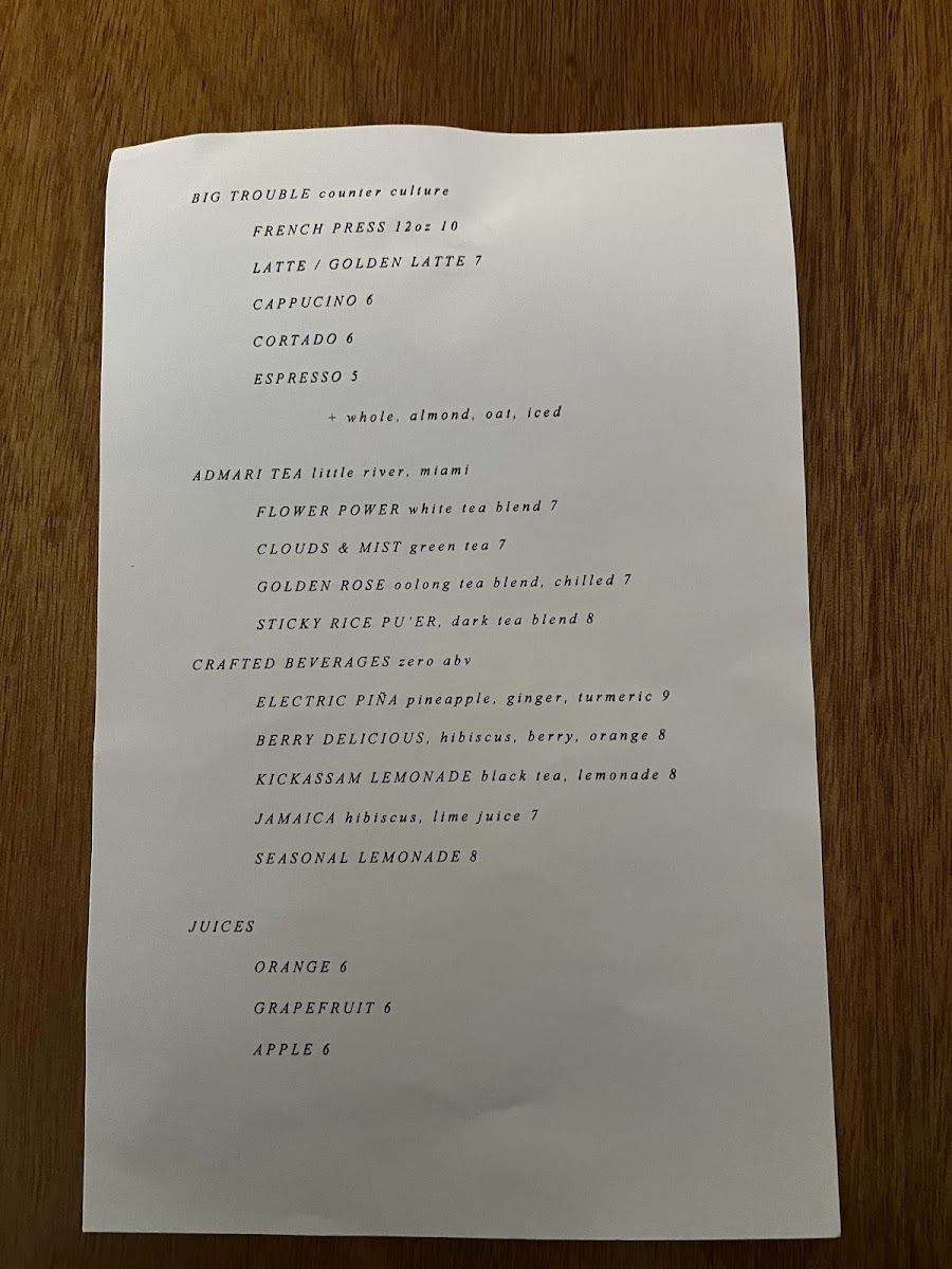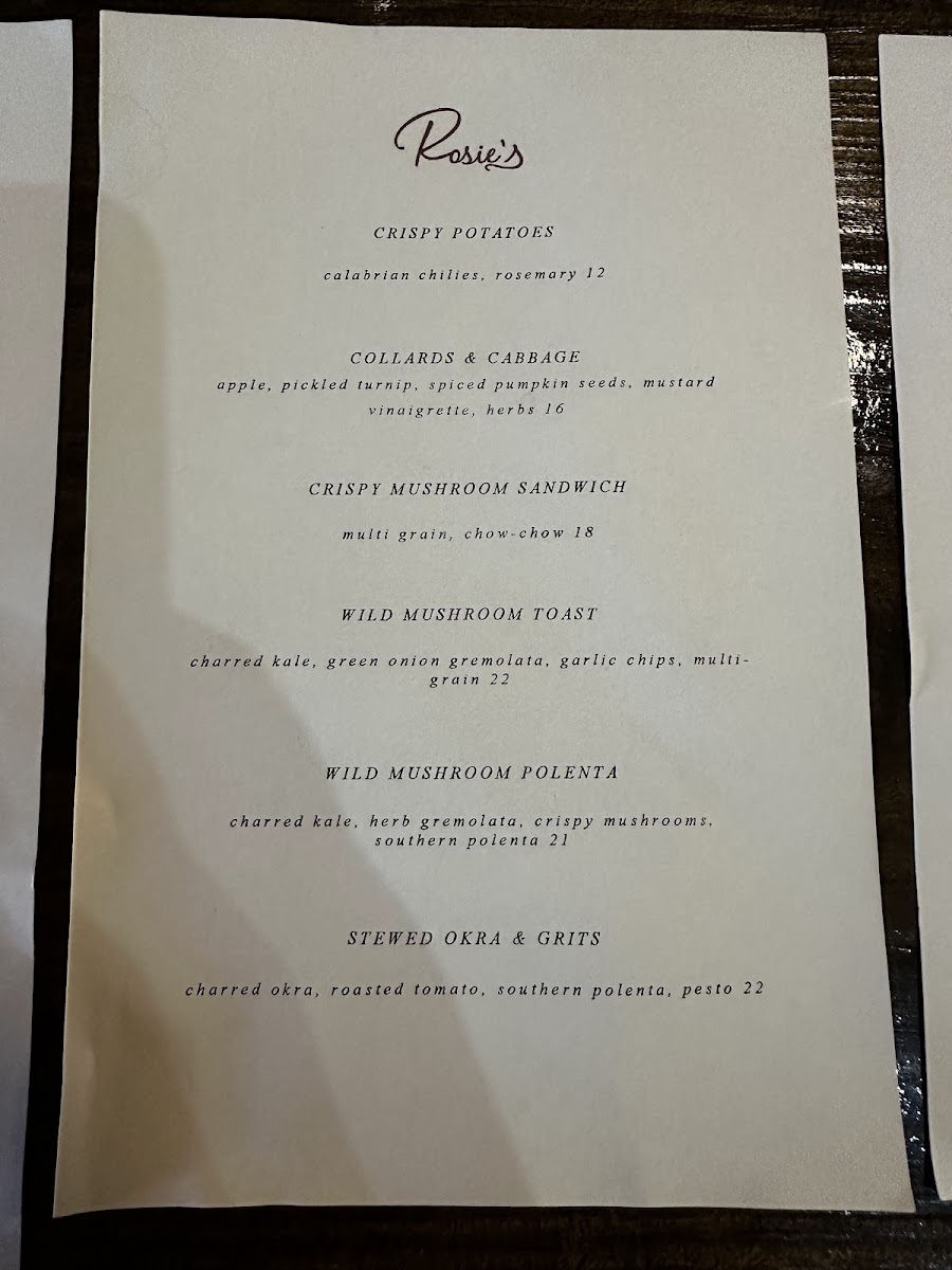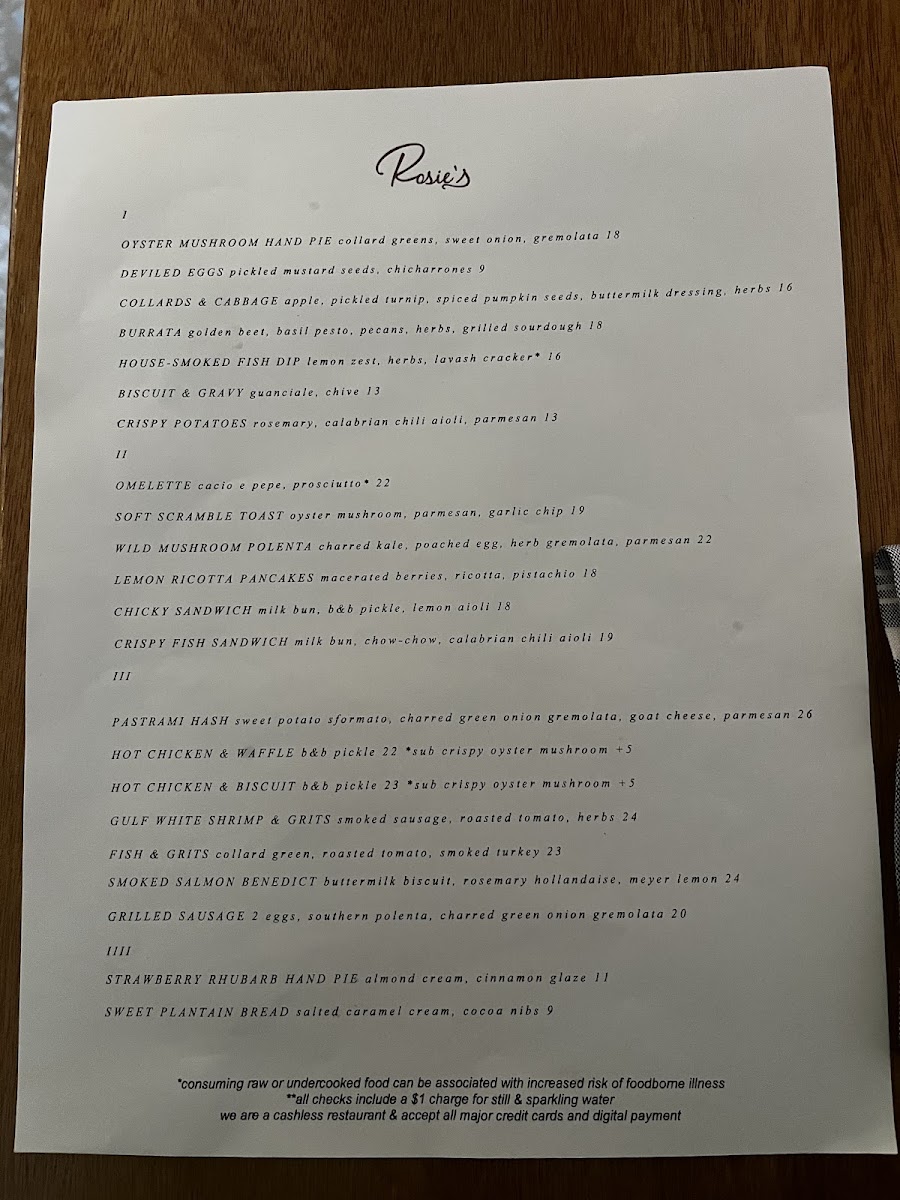 From a reviewer’s perspective, the menu at Rosie's Miami feels like a thoughtful snapshot of the restaurant’s identity-comforting, creative, and confidently curated. The pastry selection sets a warm, inviting tone with Strawberry Rhubarb Hand Pie, Lemon Pound Cake, Pumpkin Bread, Rhubarb Olive Oil Cake, and the classic SD Buttermilk Biscuit, all perfect for easing into the meal. Hot beverages such as Sticky Rice Pu’er, Berry Delicious, Flower Power, and Clouds & Mist add an artisanal, almost meditative touch, while the coffee lineup-from Cortado and Americano to Golden Latte, Argyle Cold Brew Can, and Double Espresso-rounds out the experience with dependable quality. Vegan diners are clearly considered, with satisfying options like V- Stewed Okra And Grits, V- Wild Mushroom Toast, V- Wild Mushroom Polenta, V- Crispy Potatoes, and V- Collard And Cabbage Salad standing confidently alongside the rest of the menu rather than feeling like afterthoughts. The heartier sections shine with Southern-inspired comfort dishes such as Gulf White Shrimp & Grits, Chicken & Biscuits, Smothered Chicken & Grits, Oxtail Benedict, and Grilled Sausage, while earlier sections highlight crowd-pleasers like Burrata, Whipped Ricotta Toast, Mushroom Hand Pie, Deviled Eggs, Cacio E Pepe Omelette, Avocado Toast, Lemon Ricotta Pancakes, and Crispy Mushroom Sandwich. Thoughtful sides-SD Honey, Roasted Baby Carrots, SD Crispy Fish Side Gravy, and 2 Eggs-allow for easy customization. Drinks are equally well-curated, with iced options like GOLDEN ROSE and KICKASSAM, plus an appealing mix of bubbles and rosé/orange wines by the glass and bottle, including GL Bodegas Breca, Rosé, Ca’Furian Prosecco Rosé, Antoine Muller Champagne, Flora Prosecco, and Ca’ Furian Moscato. Even the Byob Corkage Fee is clearly noted, reinforcing a sense of transparency. Altogether, the menu reads as cohesive and welcoming, blending indulgence and balance in a way that leaves a strong final impression of Rosie's Miami as a place that truly understands its guests and its culinary voice.